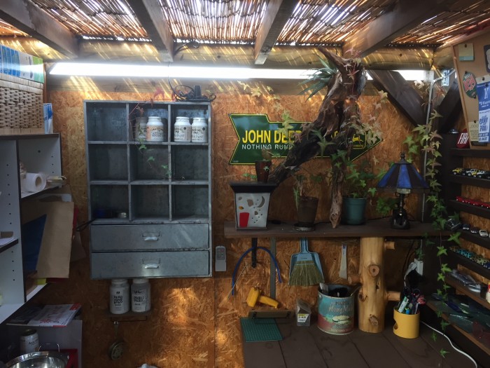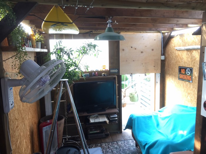 事務所の2階。秘密の工房!! 兵庫県伊丹市で外構リノベーションを手掛ける弘裕建設です。 今回は、通常の業務とは別に事務所の2階で木材の工房及びステンドガラスを作っているのでその一部をご紹介します。 こちらが事務所の2階です。 内部はこんなかたちになっております。こちらの部屋で木材の工房及びステンドガラスを作っています。 夏でも快適に作業できるように扇風機も設置しております。 もちろん、寒い冬も快適に過ごせるようにストーブも置いております。 ベランダには、椅子もあります。 鉢植えなども並べております。 次回は、夜の様子なども報告します。 2017年12月27日(水) 15:10 | カテゴリー:秘密の工房